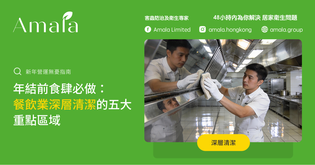 Amala Group 為香港餐飲業提供一站式年結清潔方案,針對這五大高風險區域配合專業深層清潔、滅蟲與消毒服務,幫助食肆在新年前徹底「除舊佈新」,為來年的穩定營運做好準備。