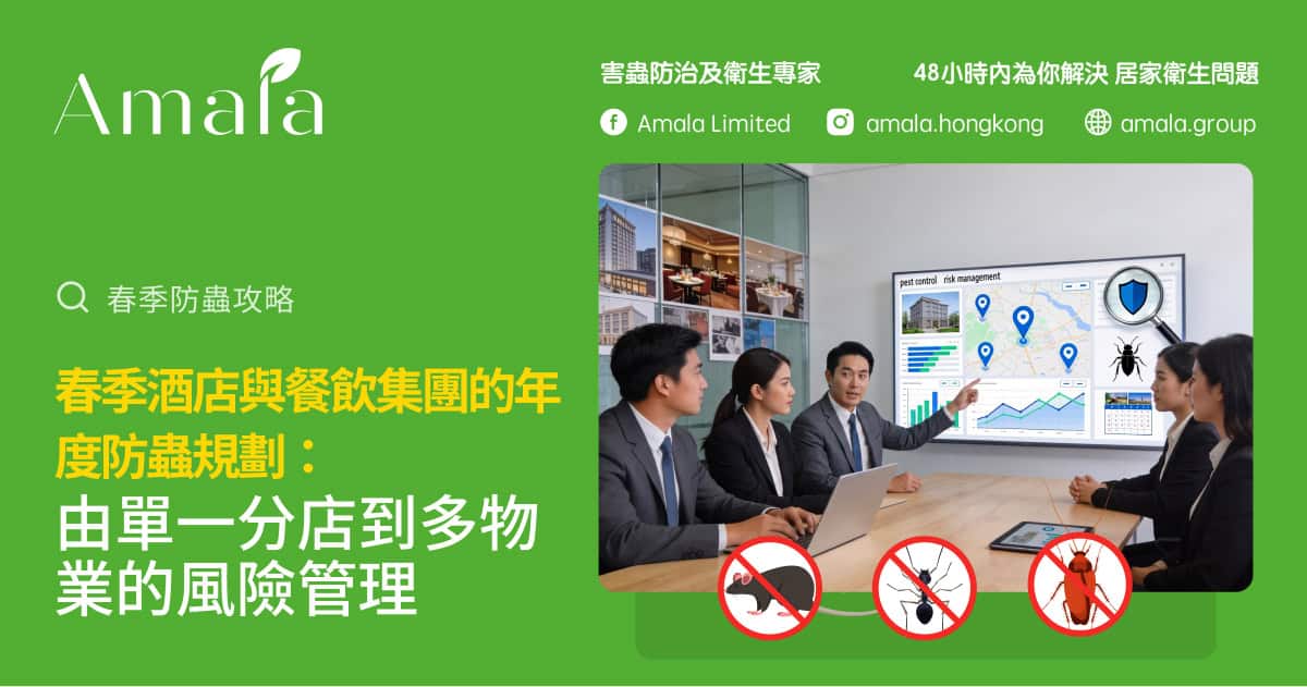 如果你是酒店或餐飲集團管理層、營運總監或物業管理負責人,希望在今年春季開始,將防蟲由「被動救火」轉為「年度風險管理的一部分」,現在就是規劃的好時機。 你可以先整理一份物業清單(包括業態、樓齡、地點)、過去一年與蟲害相關的主要投訴與個案,再連同現有防蟲安排,透過 Amala 網站表格或 WhatsApp 傳送,由專人協助你評估整個組合的風險級別,並建議適合你集團的年度防蟲規劃框架與試點方案。